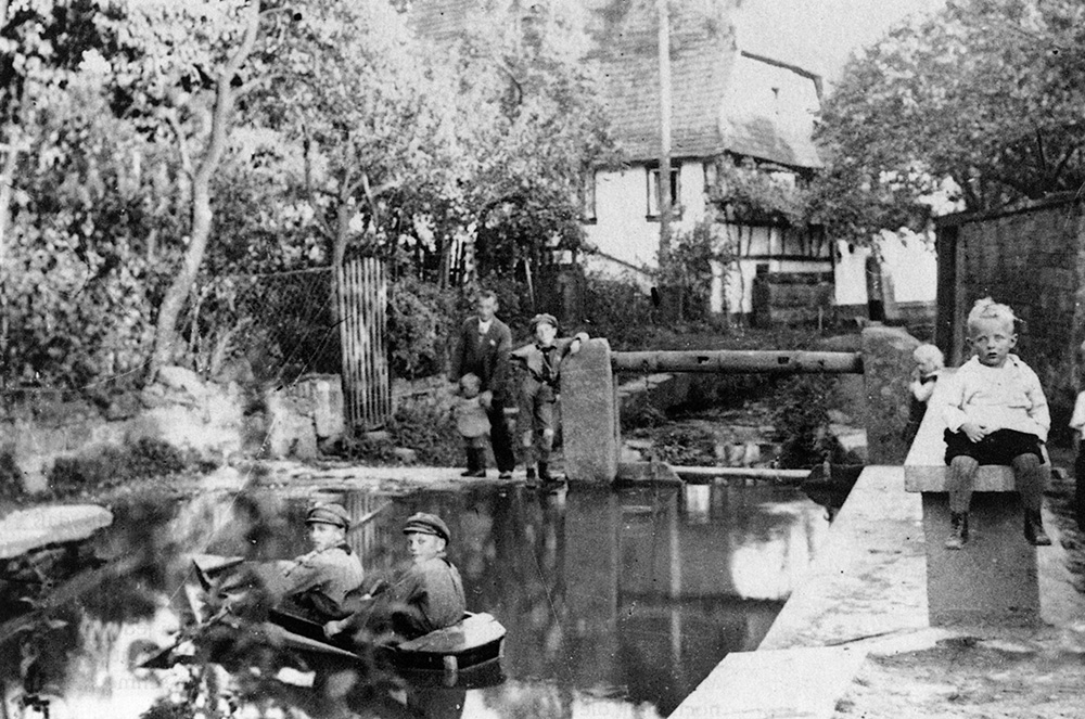 Bild: Wehr am Birnbach („Weed“) und Waschbank um 1930