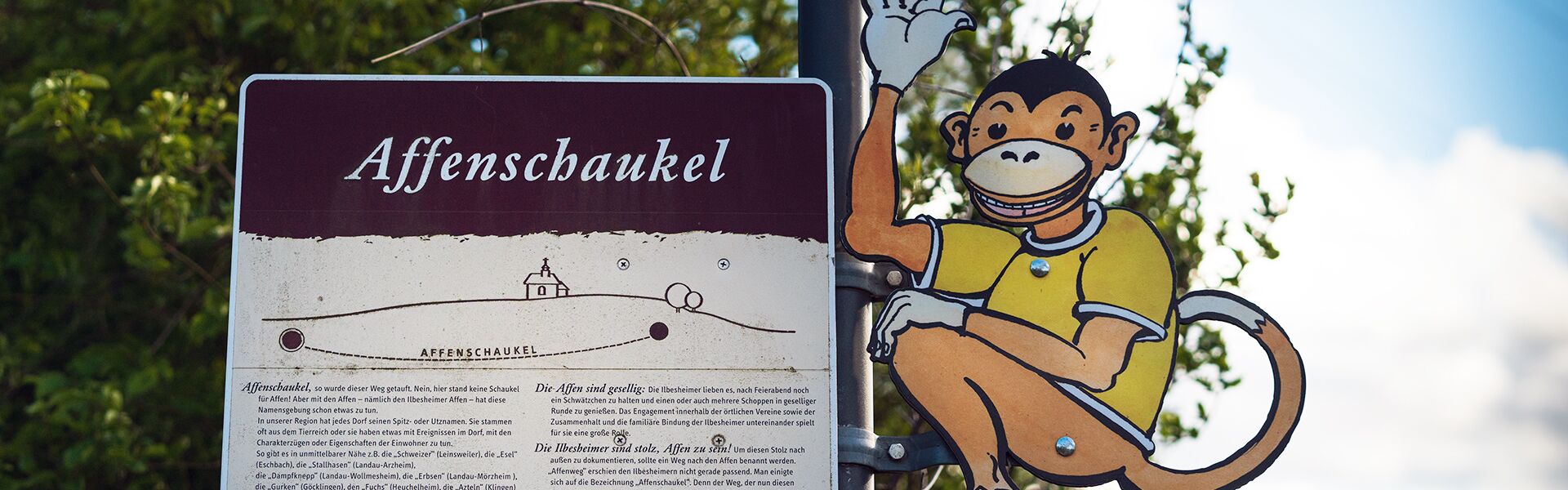 Ganz entspannt lassen wir uns deshalb gerne von unseren Nachbarn als „Ilbesheimer Affen“ bezeichnen. Wenn Sie aufmerksam durch unser Ilbesheim spazieren wird Ihnen hie und da der „Ilbesheimer Affe“ auffallen. Es gibt sogar einen Weg unterhalb der Kleinen Kalmit, der „Affenschaukel“ getauft wurde.